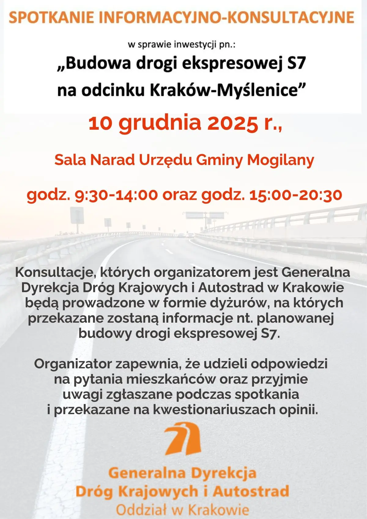 10 grudnia 2025 r. w Sali Narad Urzędu Gminy Mogilany w godz. 9:30-14:00 oraz 15:00-20:30 odbędą się spotkanie informacyjno-konsultacyjne GDDKiA w sprawie ogłoszonych wariantów tras drogi S7.