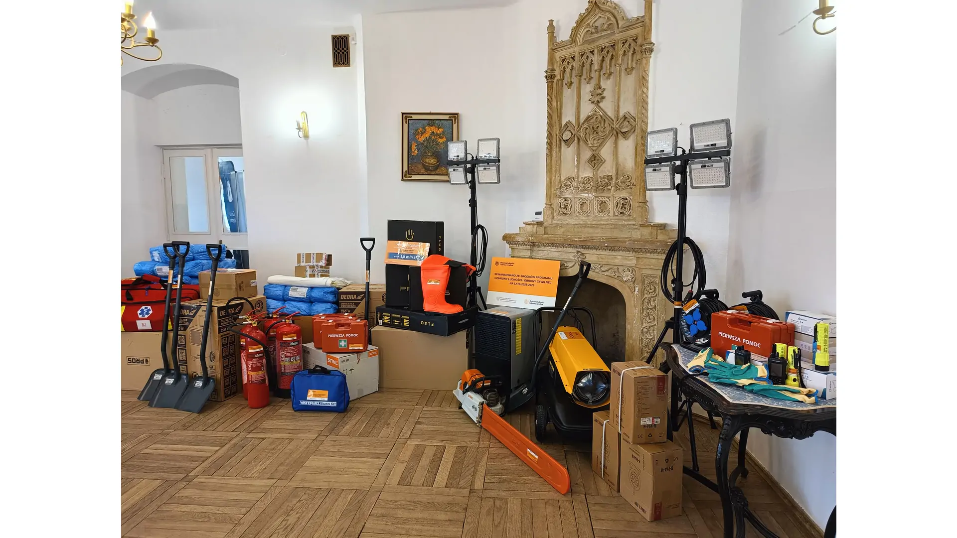 - Sprzęt przeciwpowodziowy: plandeki, łopaty oraz zapas worków na piasek.