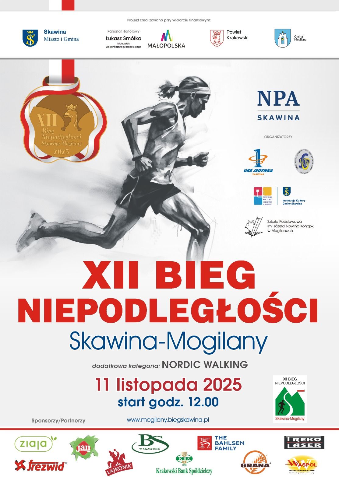 Uczcijmy Dzień Niepodległości na sportowo! 11 listopada 2025 r. zapraszamy na XII Bieg Niepodległości Skawina-Mogilany. O godz. 12.00 sportowcy wybiegną ze Skawiny, by malowniczą trasą przez Chorowice dotrzeć na Rynek w Mogilanach. Do wspólnego świętowania zapraszamy nie tylko biegaczy, ale również miłośników nordic walking.